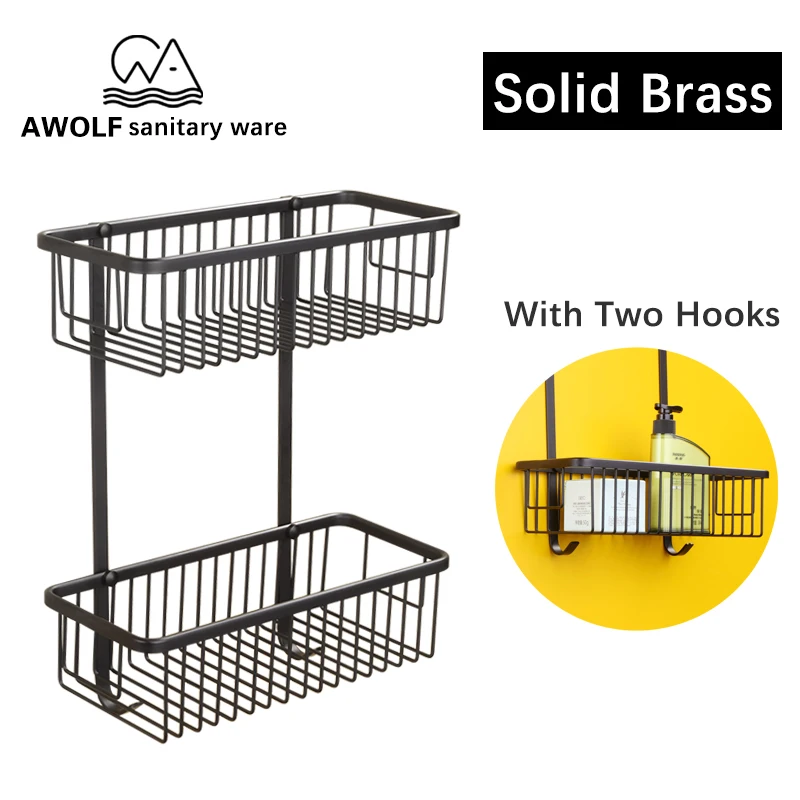 Brass 30cm Double Layer Bathroom Basket With Hooks Luxury Black