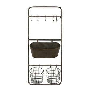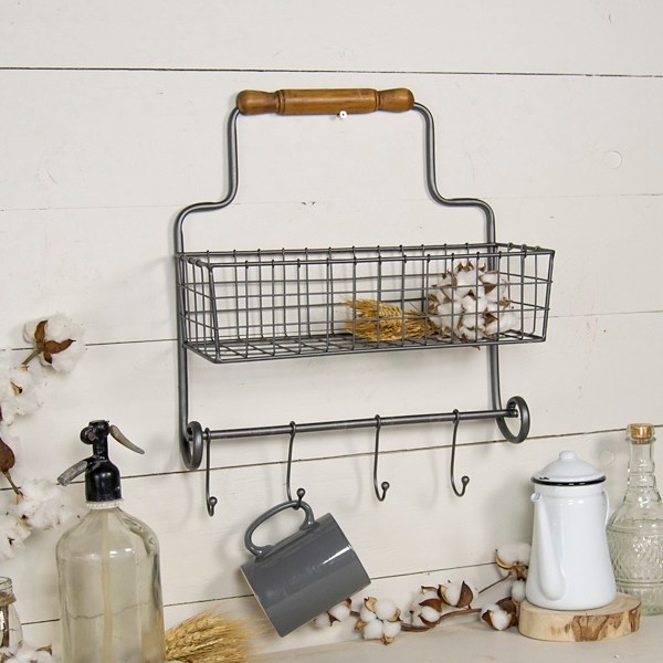 Wood And Metal Wall Basket With Hooks Bobs Com