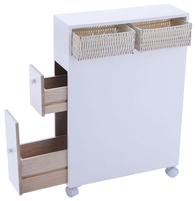 White Bathroom Storage Floor Cabinet With Baskets And Casters