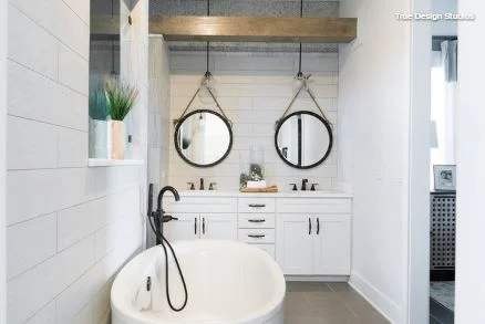 Round Rope Mirror Over Black Washstand Transitional Bathroom