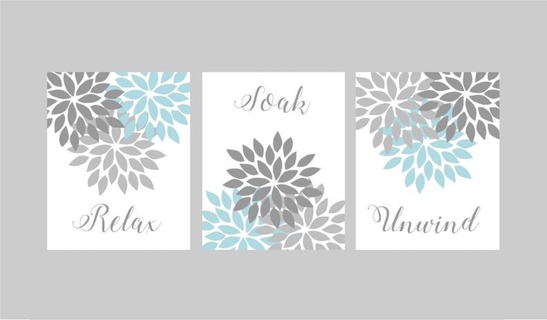 Gray Teal Bathroom Wall Word Art Picture Prints Decor Floral Relax