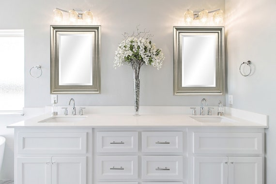 Large Beveled Beaded Mirror Over White Dual Bath Vanity