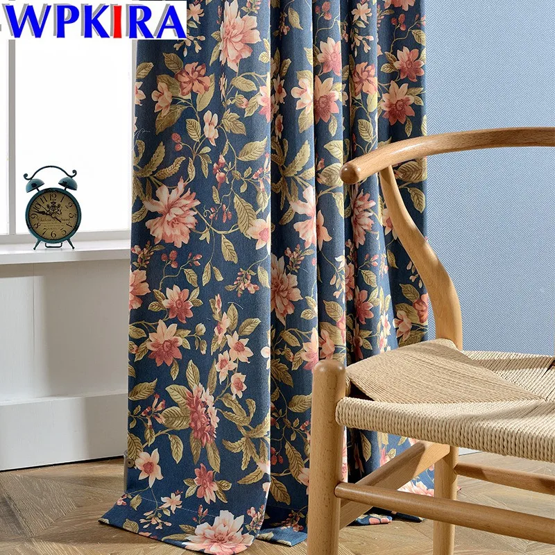 Blue Floral Print Linen Country Curtains For Bedroom Or Living