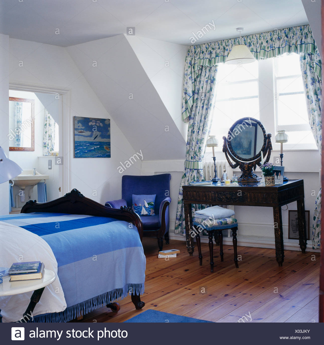 Blue Floral Curtains On Window Above Antique Dressing Table And