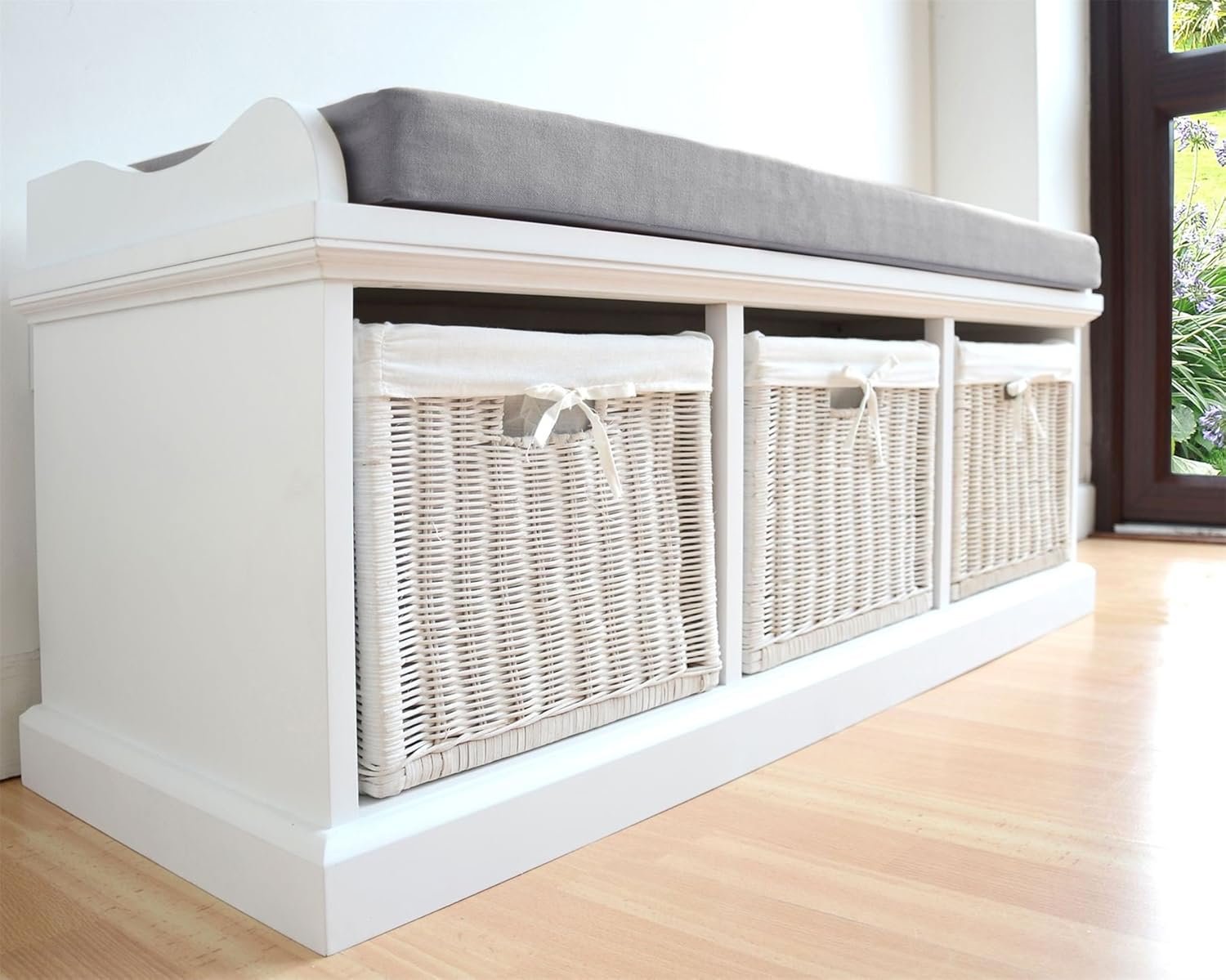 Tetbury White Bench With Cushion And Storage Baskets Assembled