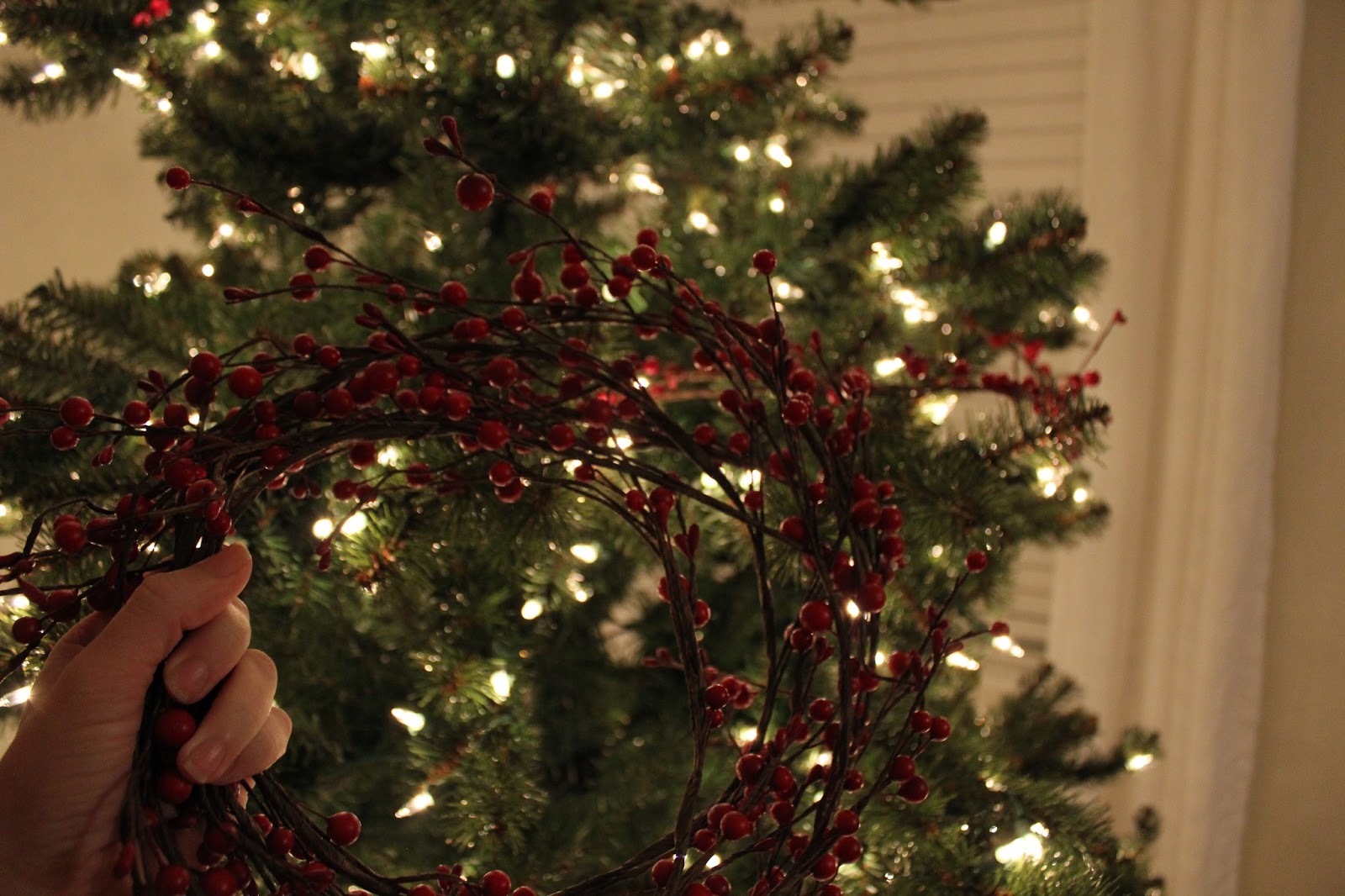 A Tree Is Decorated With Lights And Berry Garland Sits In An Old