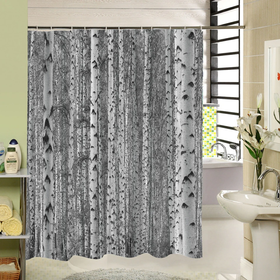 Polyester Waterproof Fabric Shower Curtain Set Hooks Birch Forest