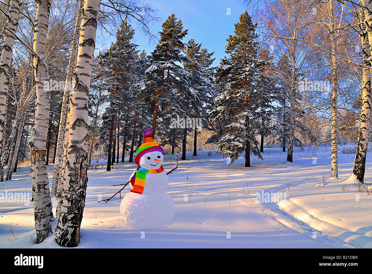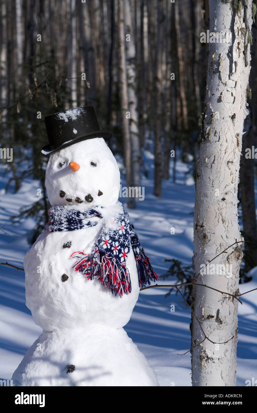 Snowman In Top Hat Scarf Deep In Birch Forest Interior Alaska