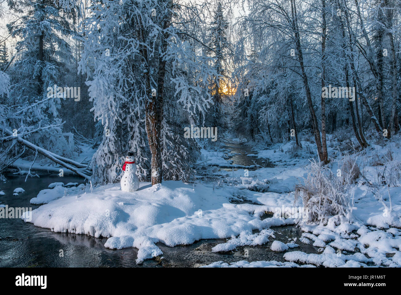 Snowman Along Hoarfrost Covered Birch Trees And A Creek At Sunset