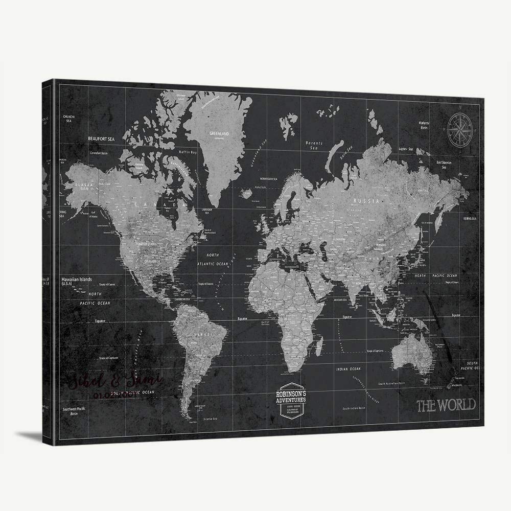 Amazon Com Black Grey Personalized World Map Wall Art Canvas Print Custom Travel World Map Print Art Large Wall Art World Map Canvas Art Large Wall Art World Map Push Pin Canvas Print