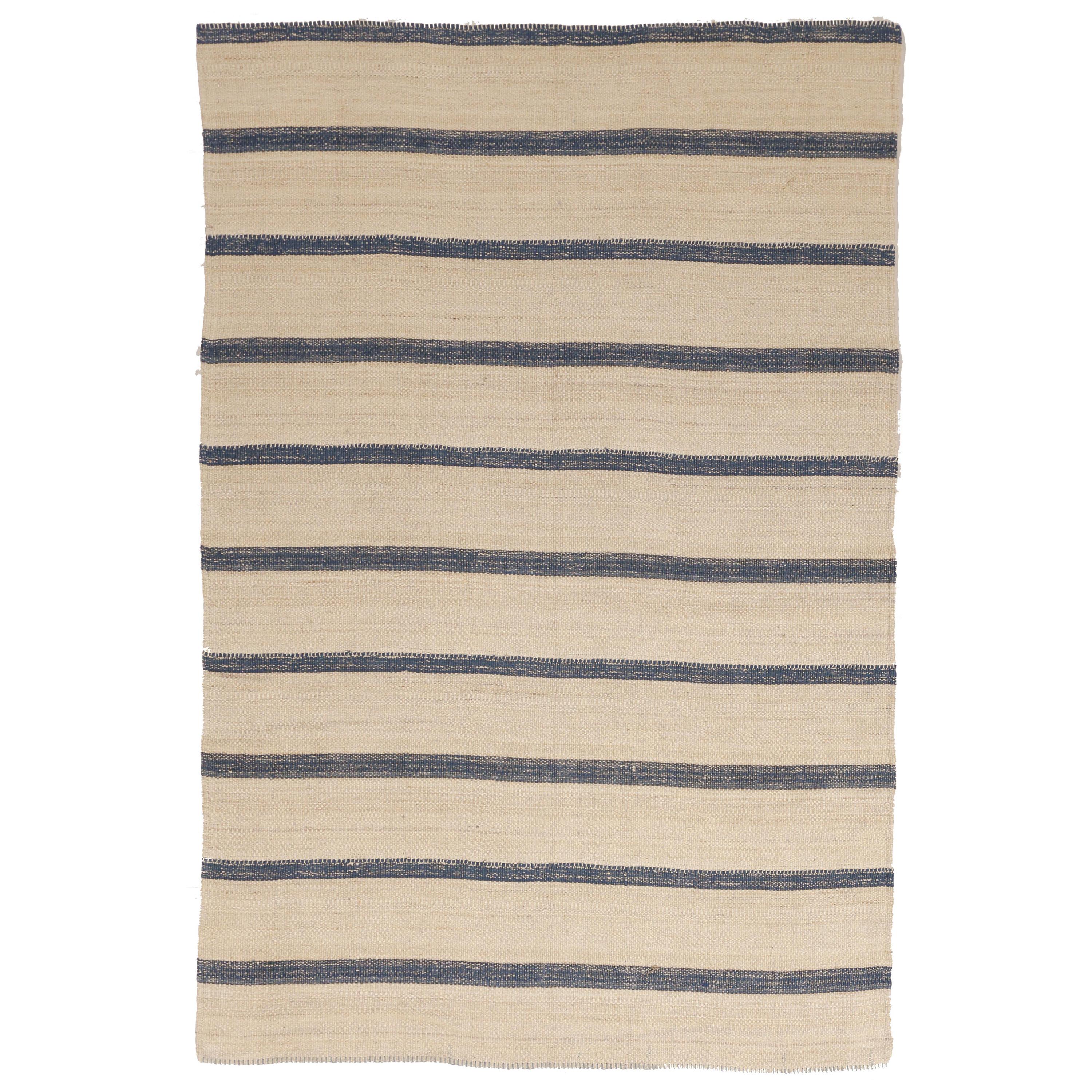 Modern Persian Kilim Rug With Black And Brown Stripes On Ivory