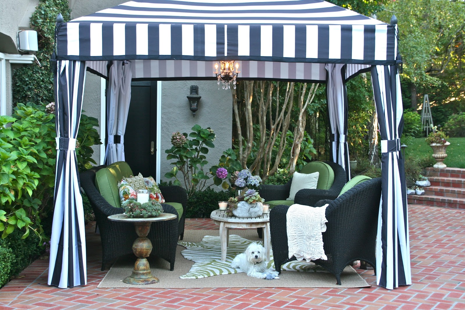 Elegant Patio Seating Area Black And White Cabana Stripe Awnings