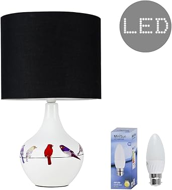 Modern Birds On A Wire Design White Ceramic Table Lamp With A Black Cylinder Light Shade Complete With A 4w Led Candle Bulb 3000k Warm White By Minisun Amazon Co Uk Lighting