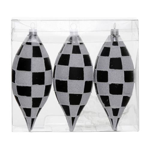 Pack Of 3 Black Matte White Glitter Checkered Christmas Teardrop