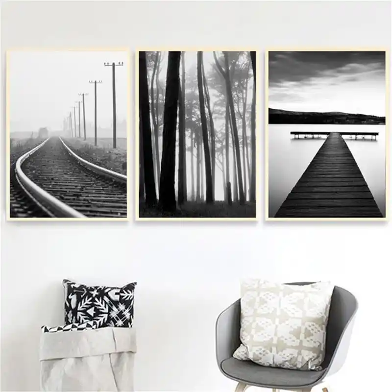 Modern Black And White Forest Railway Seascape Wall Art Canvas