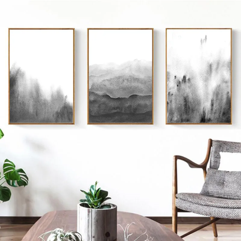 Nordic Wall Art Black White Misty Forest Canvas Painting Landscape