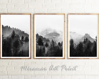 Nordic Wall Art Snow Mountain Poster Black And White Foggy Forest