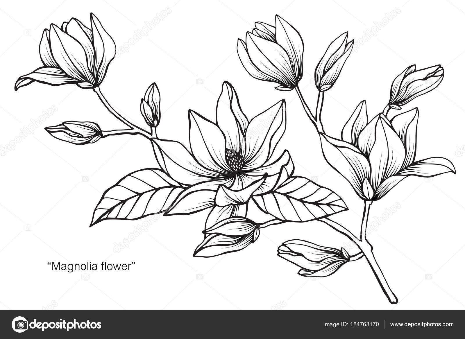 Magnolia Flower Drawing And Sketch With Black And White Line Art
