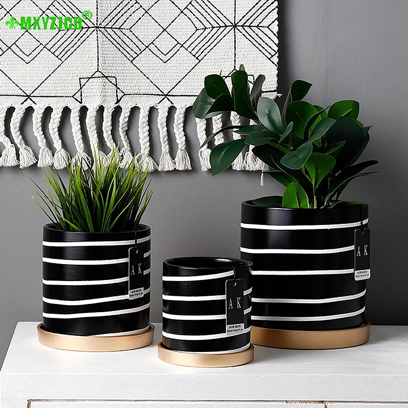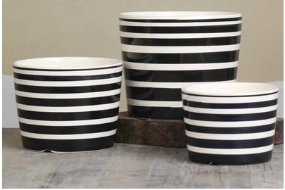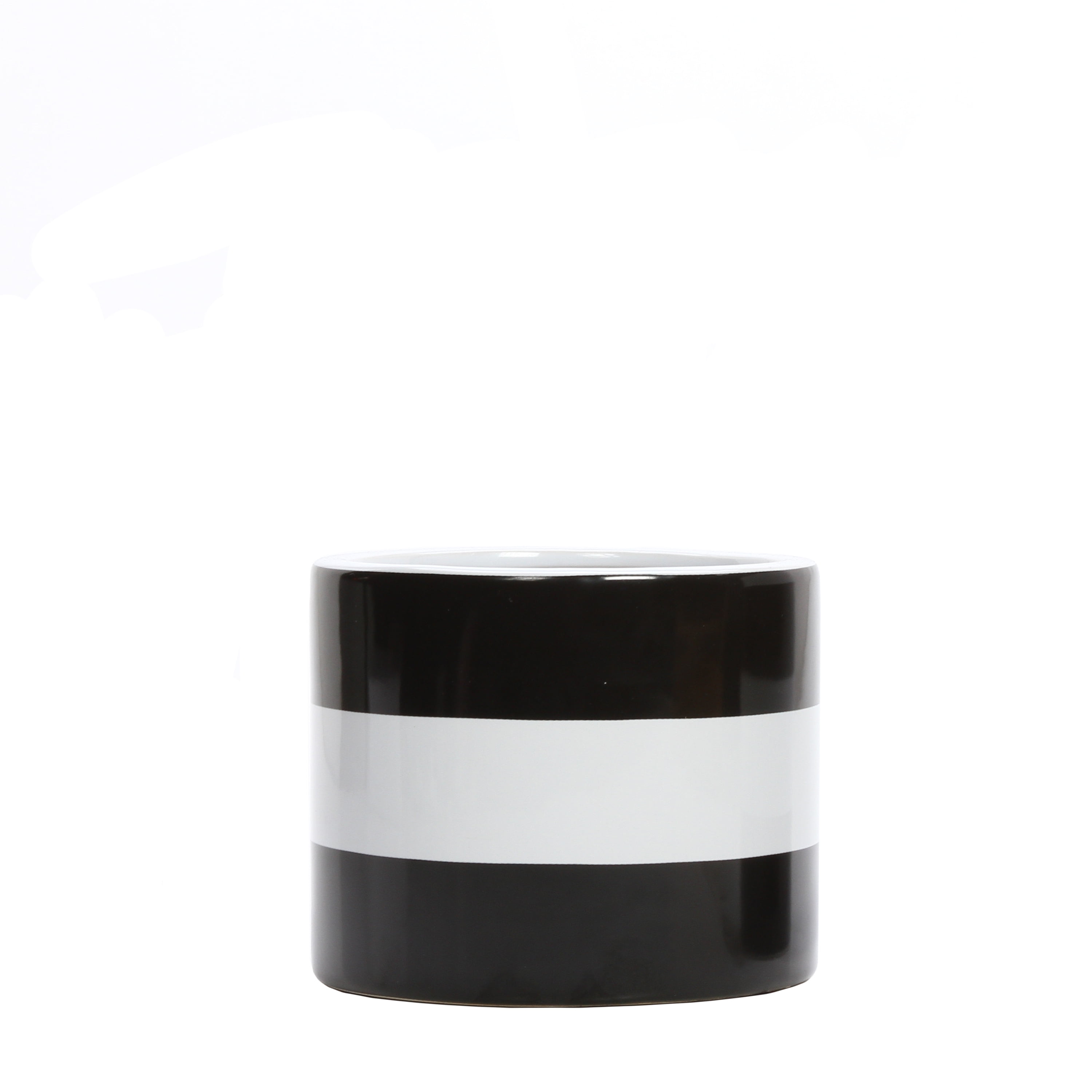 Black And White Striped Ceramic Flower Pot With Tray Round Potted