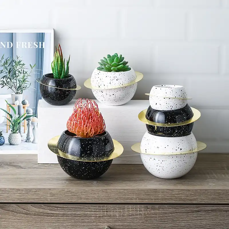Black White Planet Ceramic Flower Pots With Metal Ring Creative