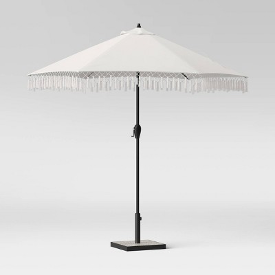 9 Round Fringed Patio Umbrella Linen Black Pole Opalhouse