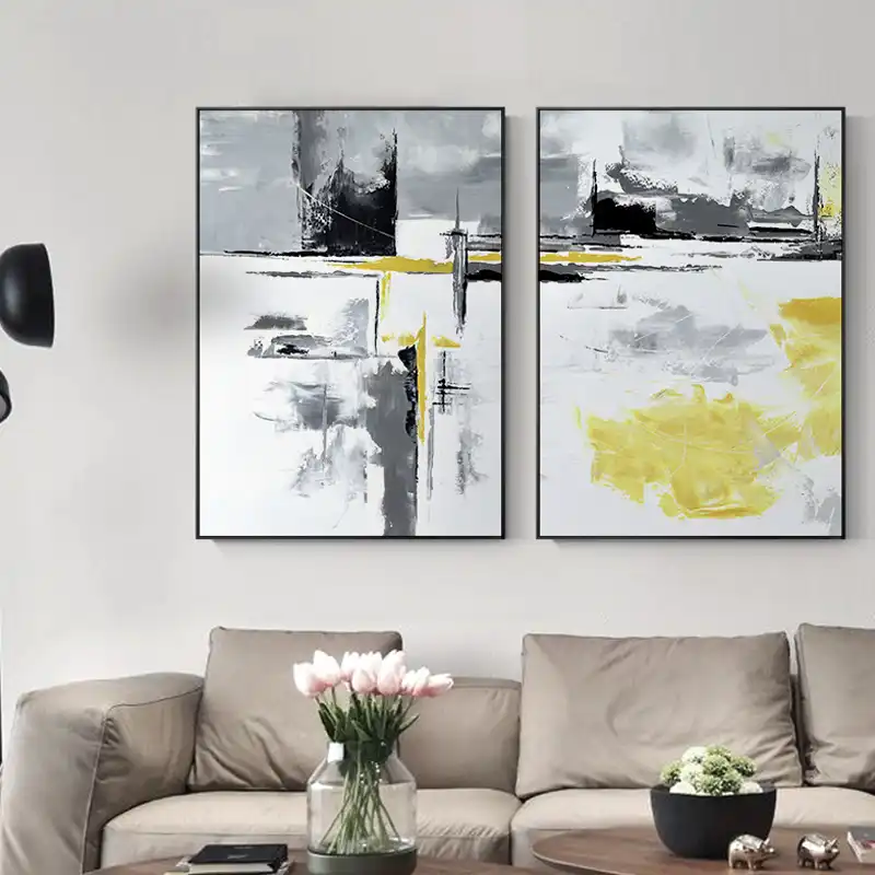 Handmade Abstract Art Canvas Painting Yellow Black Gray Extra
