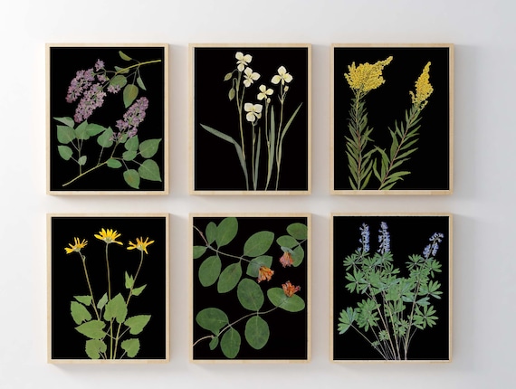 Set Of 6 Black Botanical Prints Pressed Flowers With Black Etsy