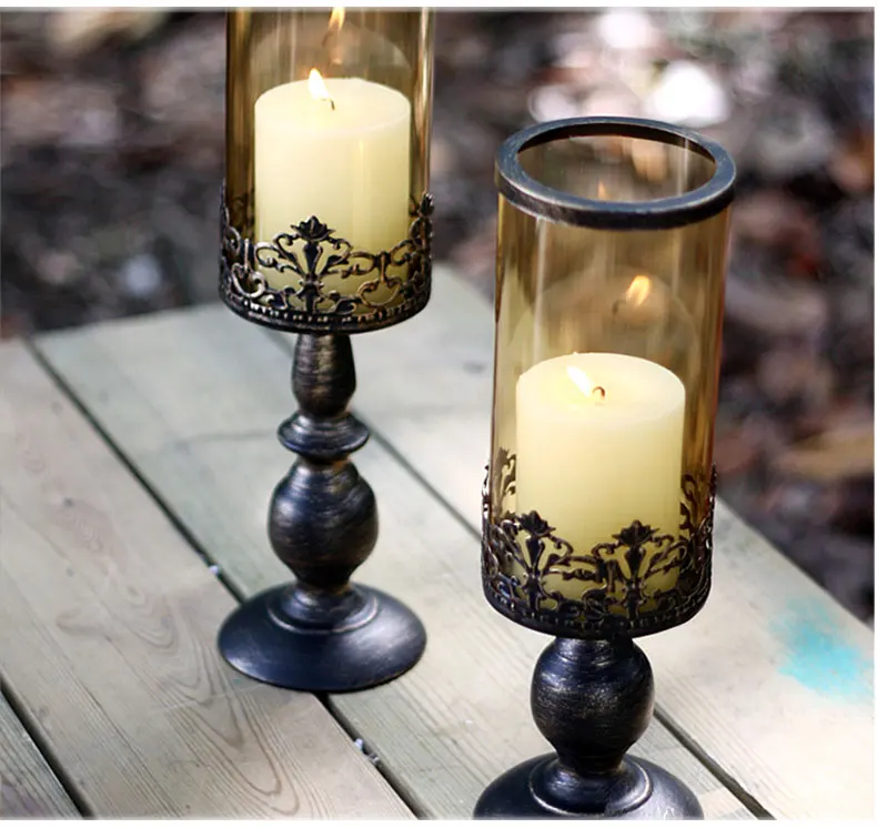 2pcs Set Iron Metal Candle Holder Set With Glass Cover Pillar