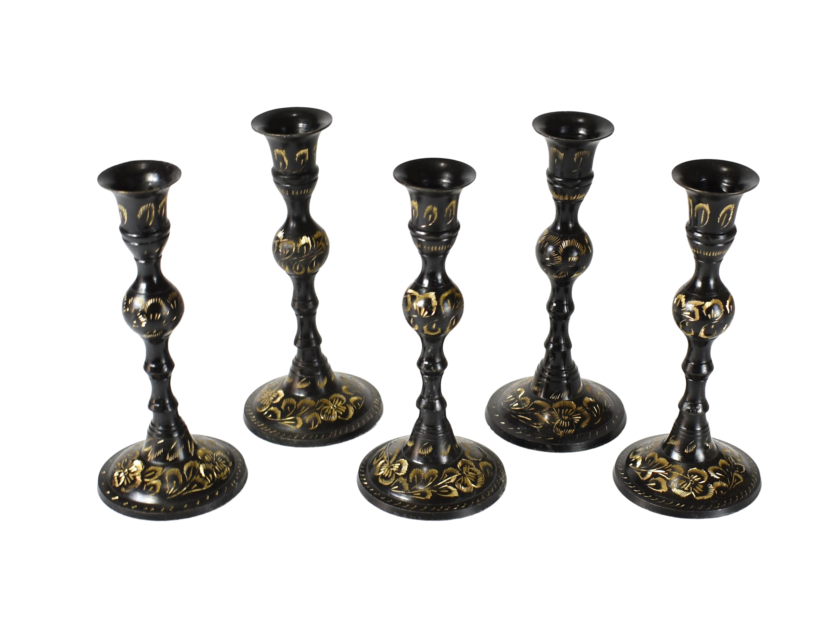 Vintage Gold And Black Brass Hand Etched Floral Design Candlestick