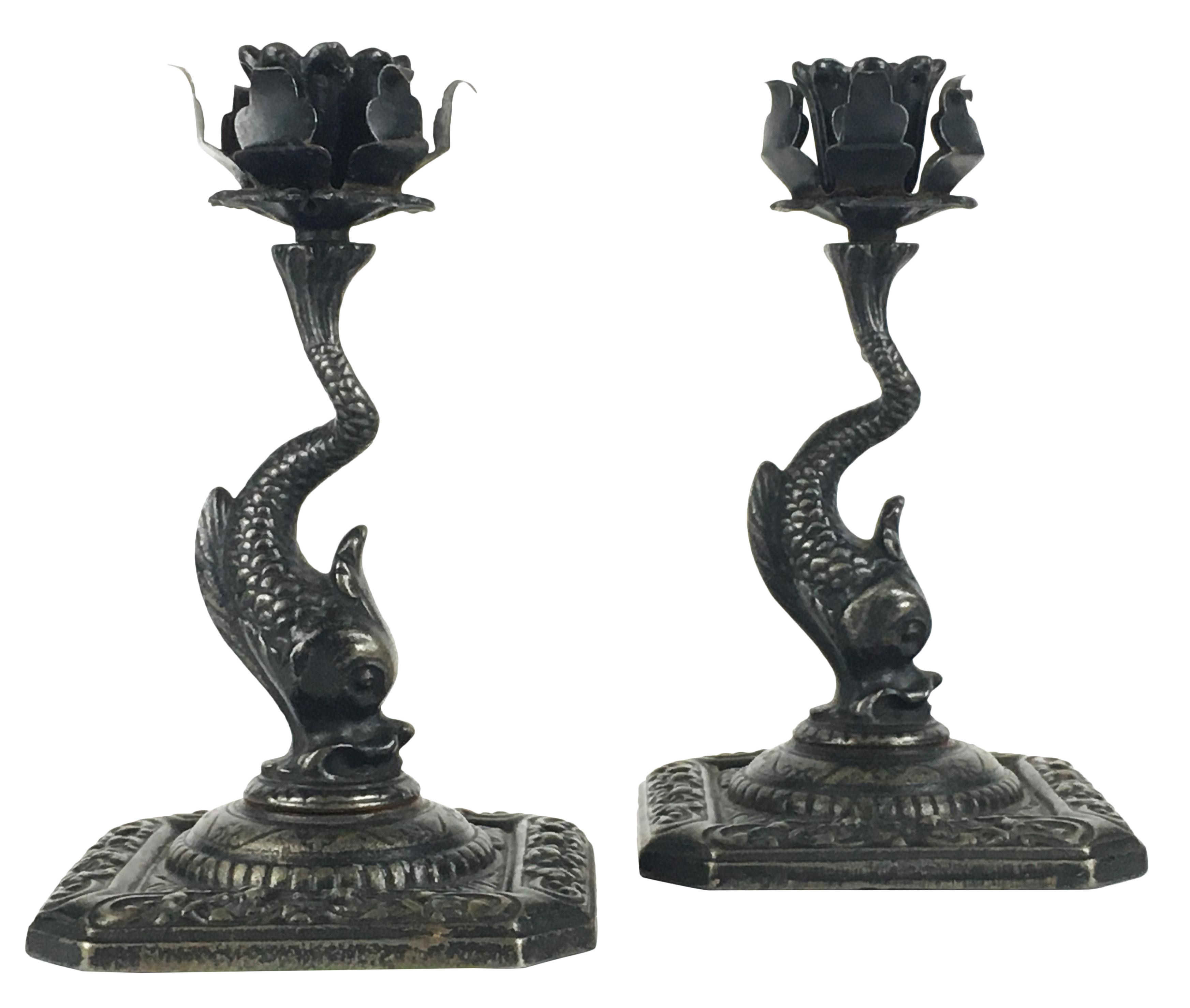 Antique 19th Century Black Cast Iron Dolphin Candlesticks A Pair