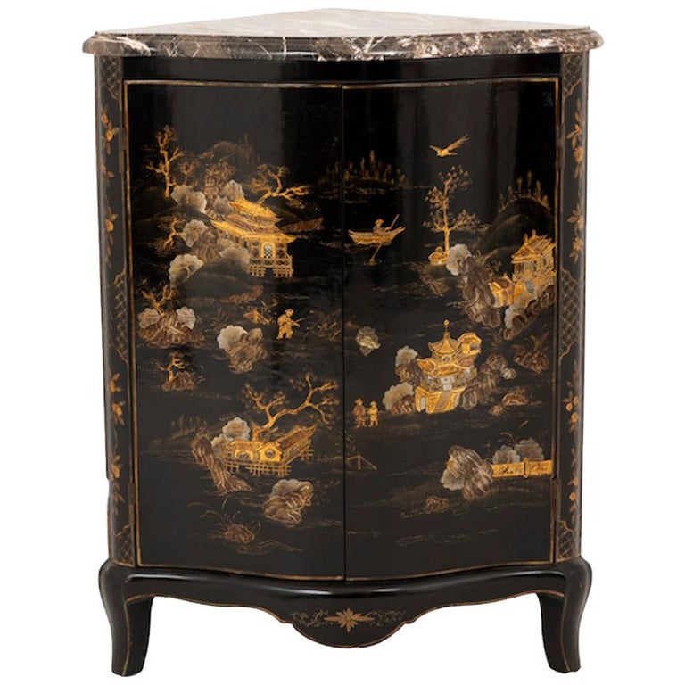 Louis Xv Style Corner Cabinet In Black Lacquer With A Chinese