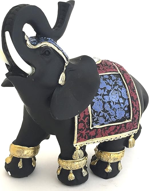 Three Hands Resin Black Elephant Statue With Ornate Golden Tack