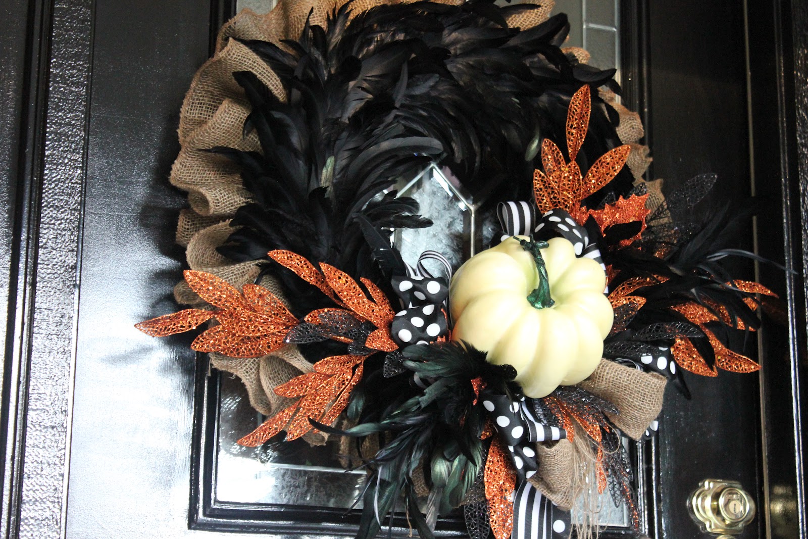 Black Feather Wreath With Pumpkins And Blackbird Diy Halloween