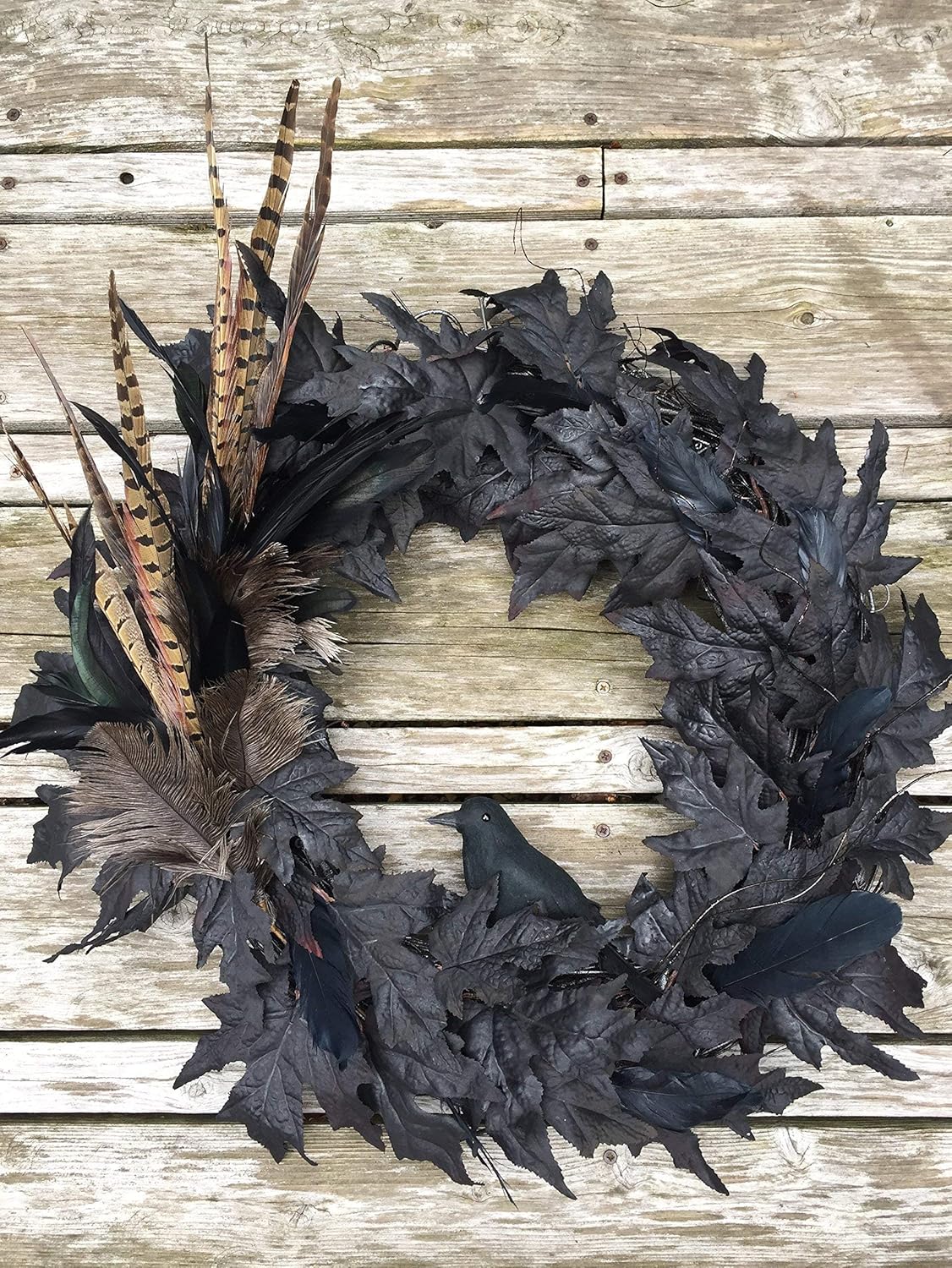 Amazon Com Spooky Black Crow Feather And Leaf Halloween Wreath
