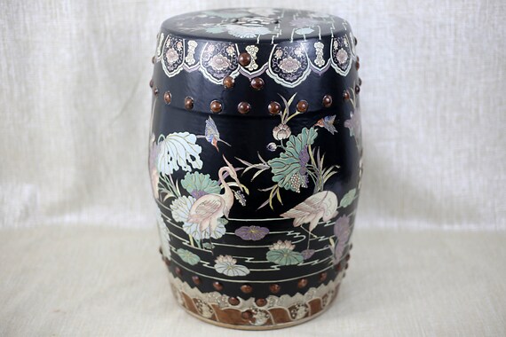 Vintage Black Garden Stool With Cranes And Lotuses Etsy