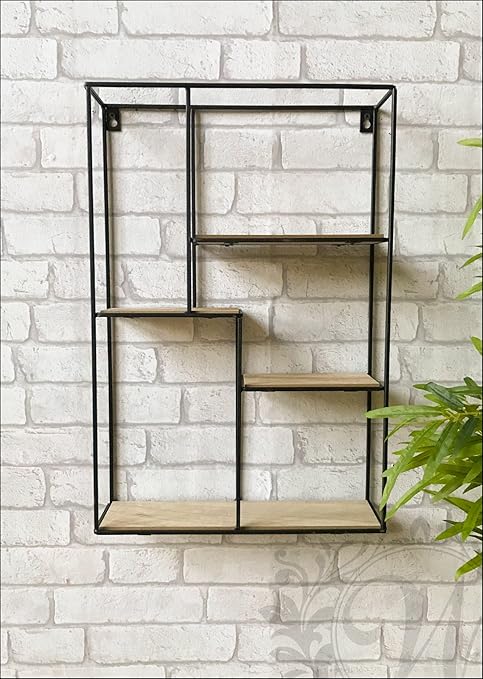 Rectangular Black Wall Unit With Shelves Metal And Wood Industrial