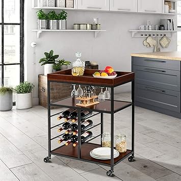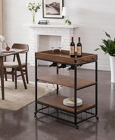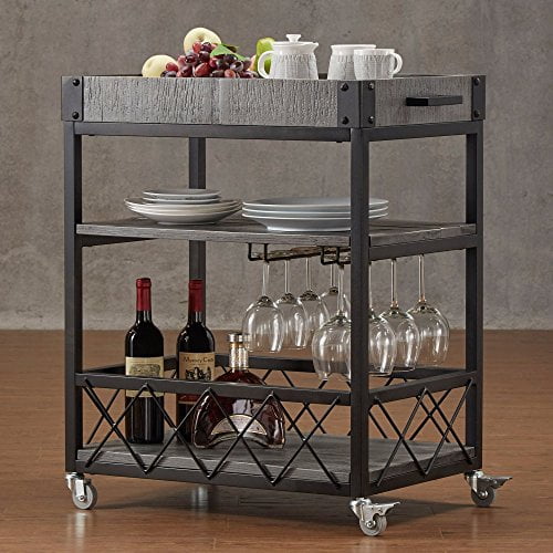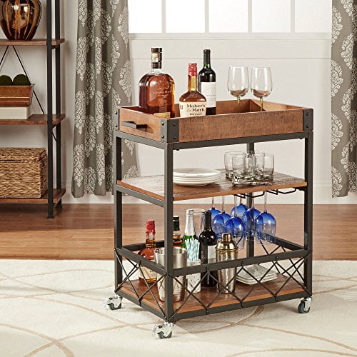 Modhaus Living Modern Style Rustic Mobile 3 Tier Kitchen Bar Serving Rolling Wine Cart With Removable Tray Top And
