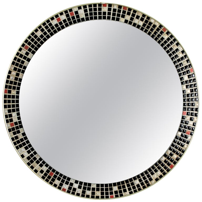 Midcentury Black And White Tile Mosaic Round Mirror Spain 1960s