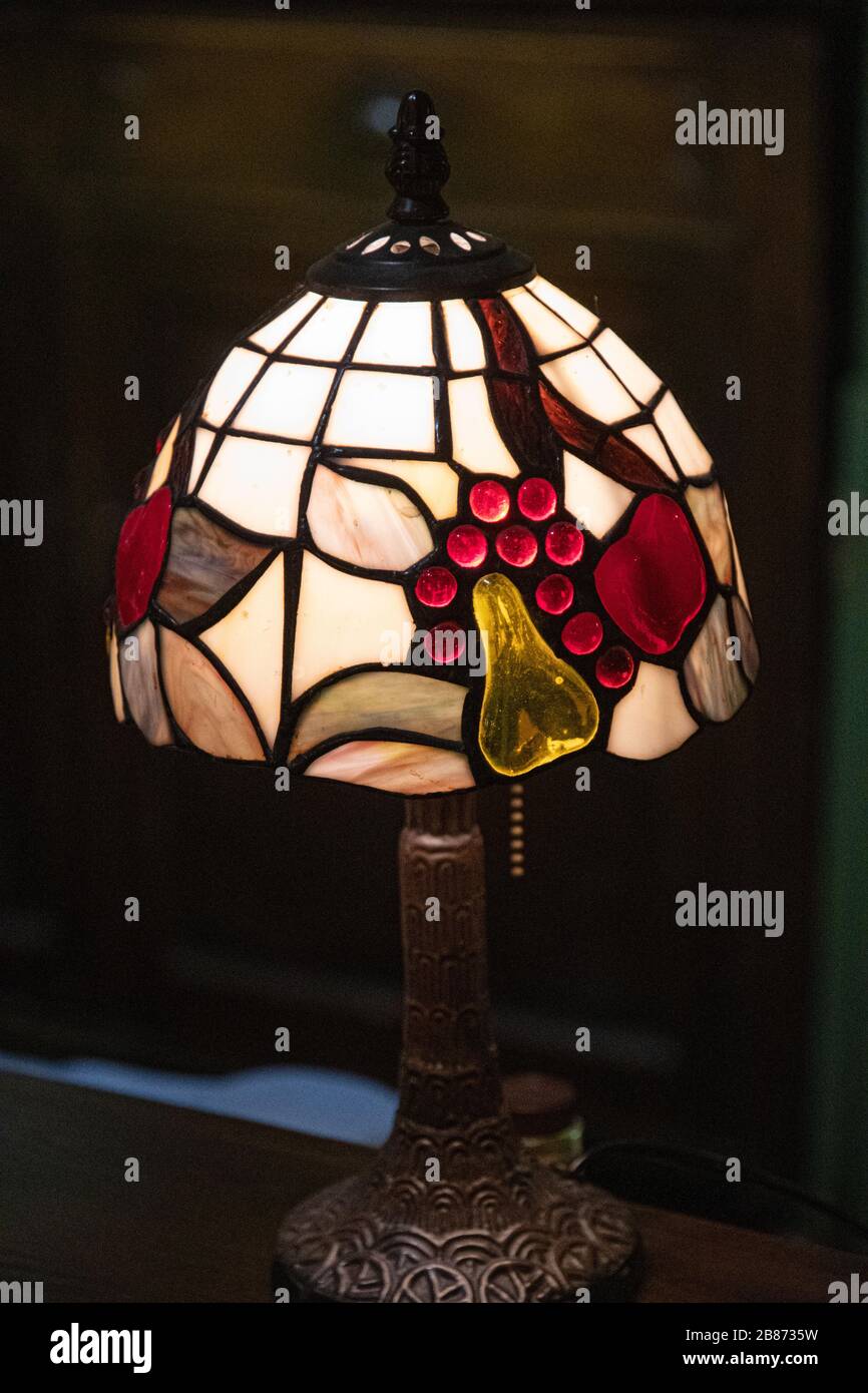 Closeup Of Antique Table Lamp With Stained Glass Lampshade On