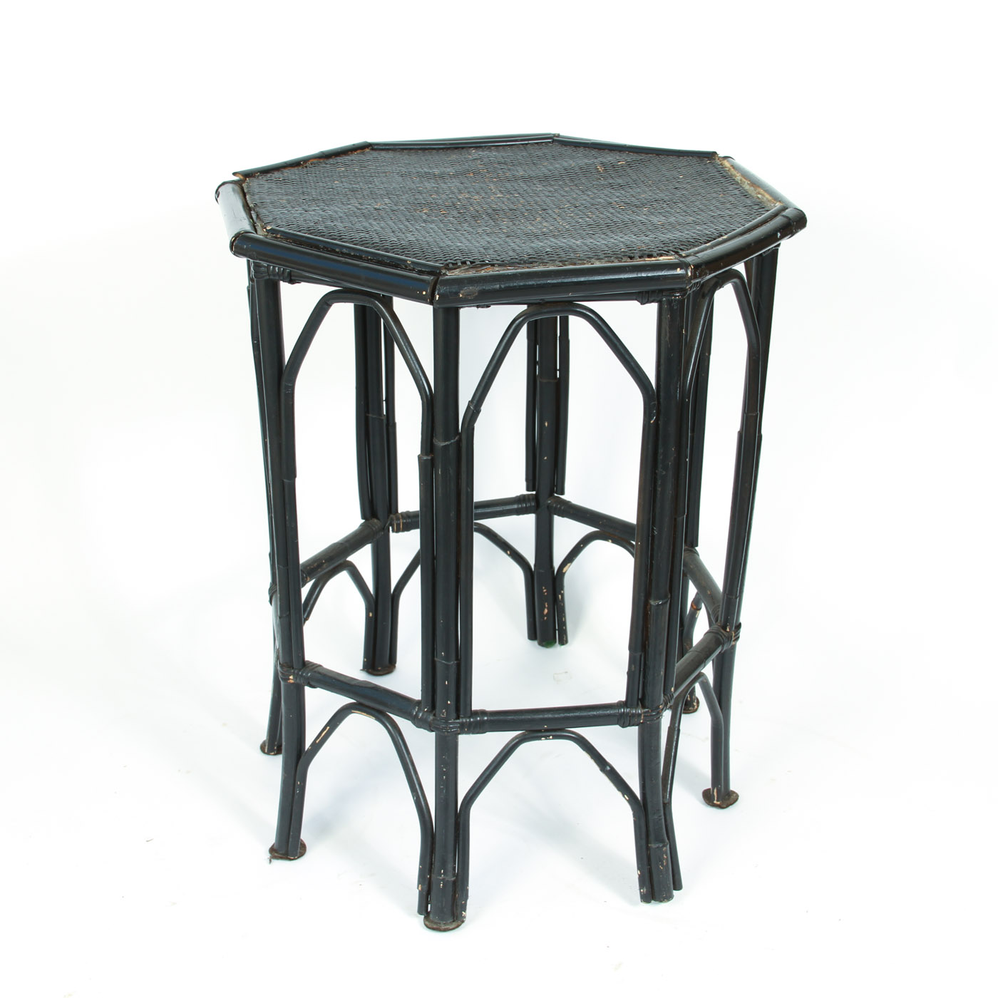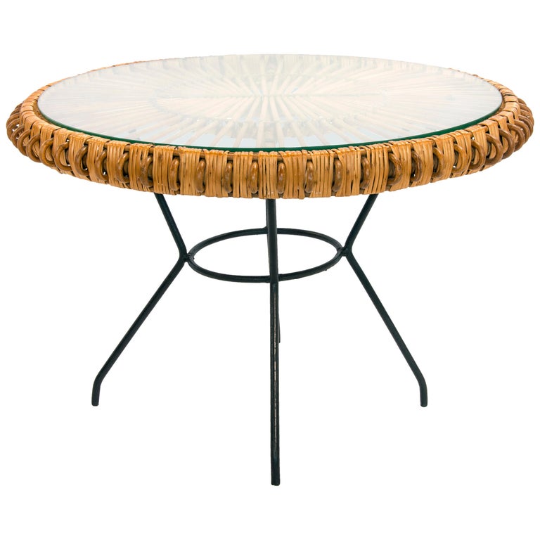 Midcentury Rattan Side Table On A Painted Black Metal Tripod Base