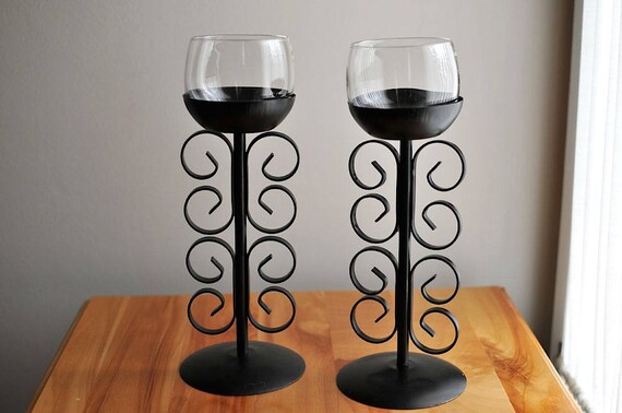 Two Black Metal Scroll And Glass Vintage Candle Holders Etsy