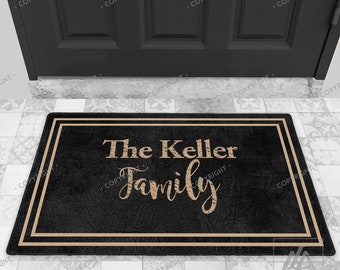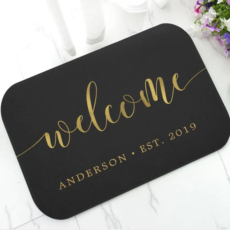 Trendy Black And Gold Welcome Script Personalized Doormat Custom
