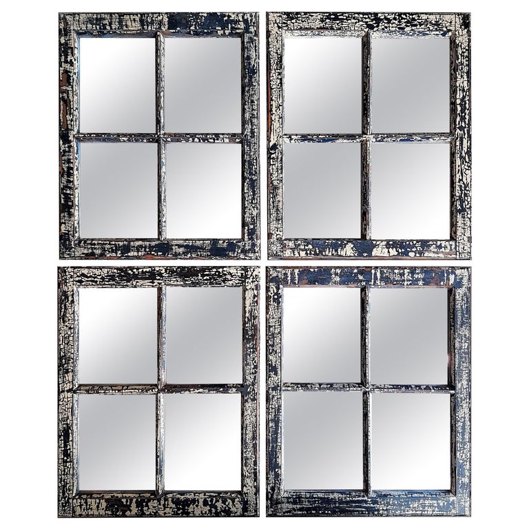 Set Of Four Classic Blue And Ecru Patina Industrial Wooden Window