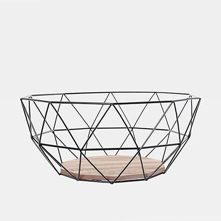 Modern Black Wire Fruit Bowl Basket Centerpiece Wooden Bottom