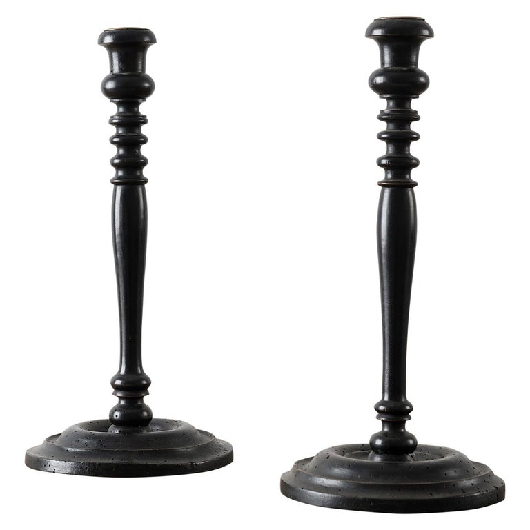 Beautiful Pair Of Simple Georgian Black Turned Wood Candlesticks