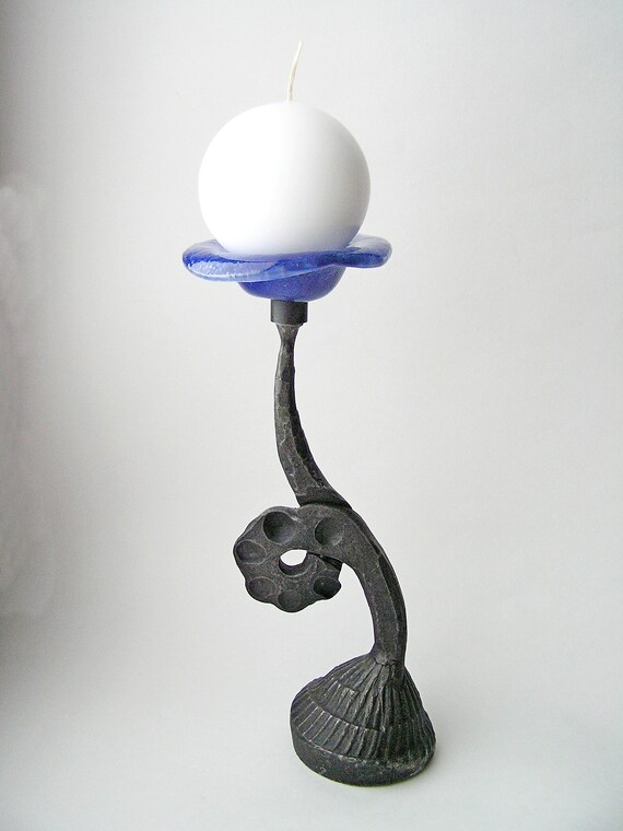Pillar Iron Candle Holder With Glass Base Blue Color For The Etsy